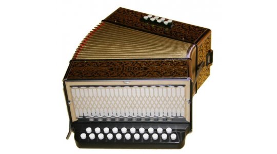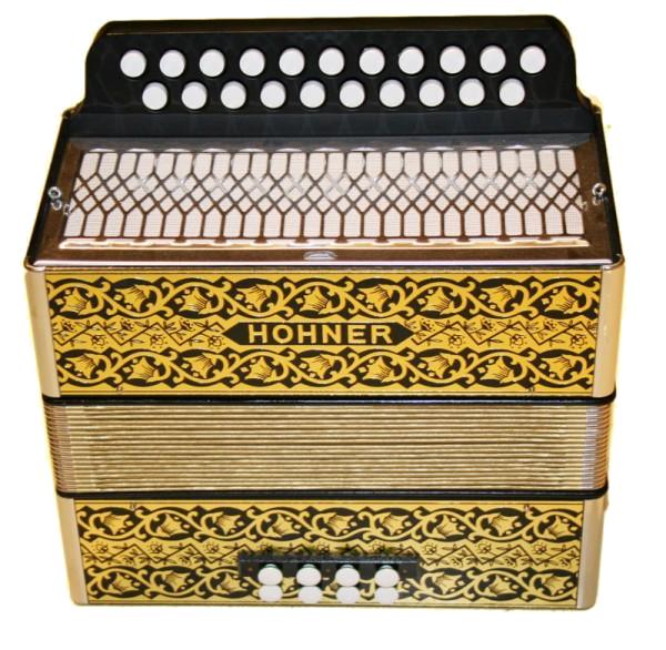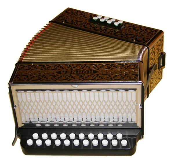 Auch diese Harmonika- wie alle Wiener Modelle- in traditioneller Holzbauweise mit "Goldbrand"-Verzierung. 2 Jahre Garantie.
