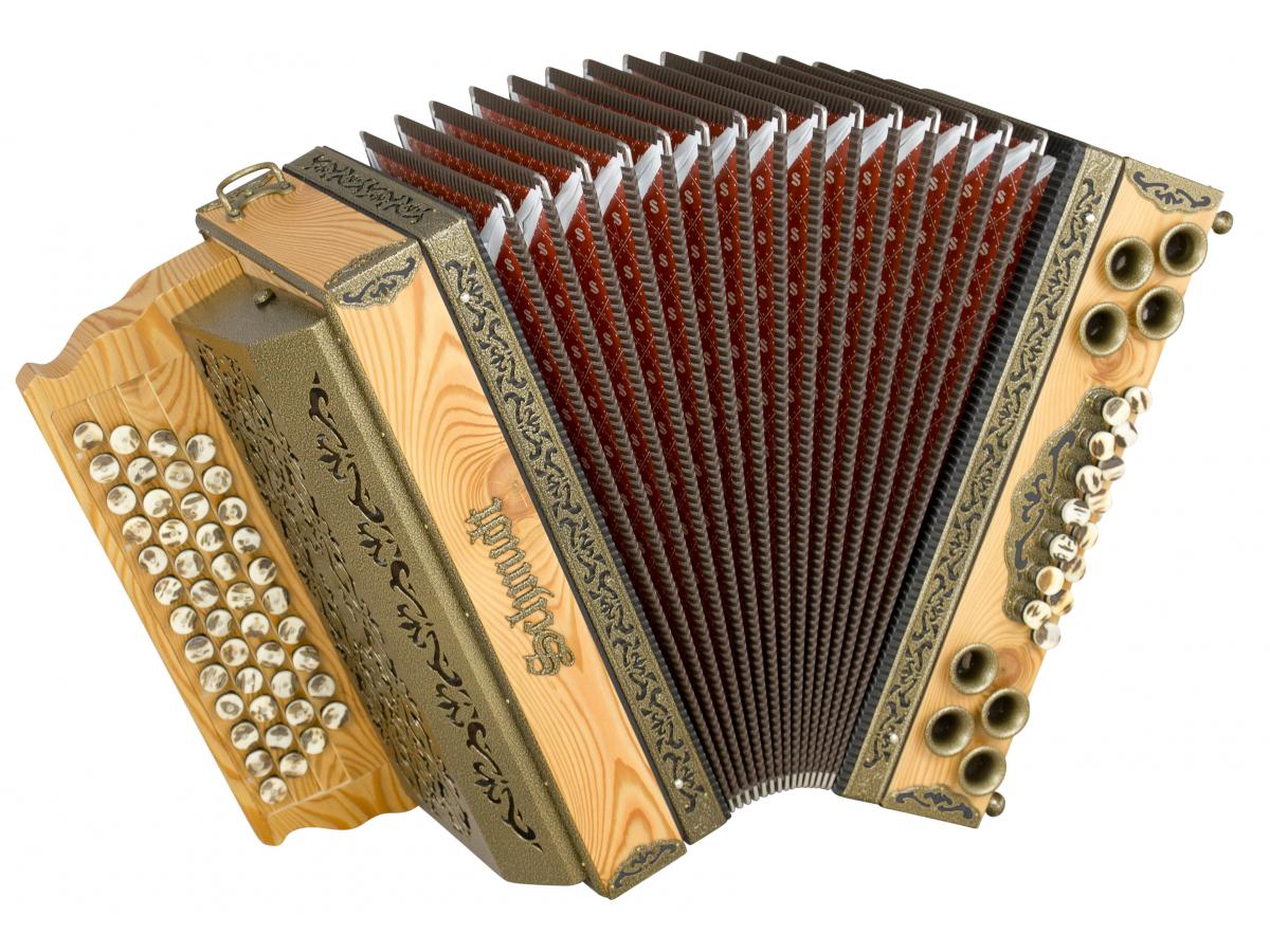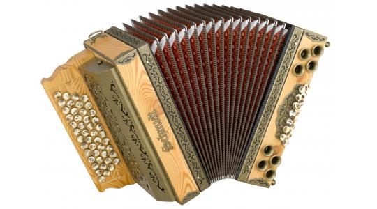 Ein Modell voller Überraschungen: Rustikales Design, als ob die Harmonika 50 Jahre am Dachboden gelegen wäre, technisch jedoch auf dem neuesten Stand. Neueste Beschläge, kratzfestes Design in Schwarz-Silber oder Schwarz-Gold, leicht gebürstete (Alt)Hölzer, Knöpfe aus echtem Horn oder Holz verleihen der Harmonika eine rustikal-edle Anmutung.