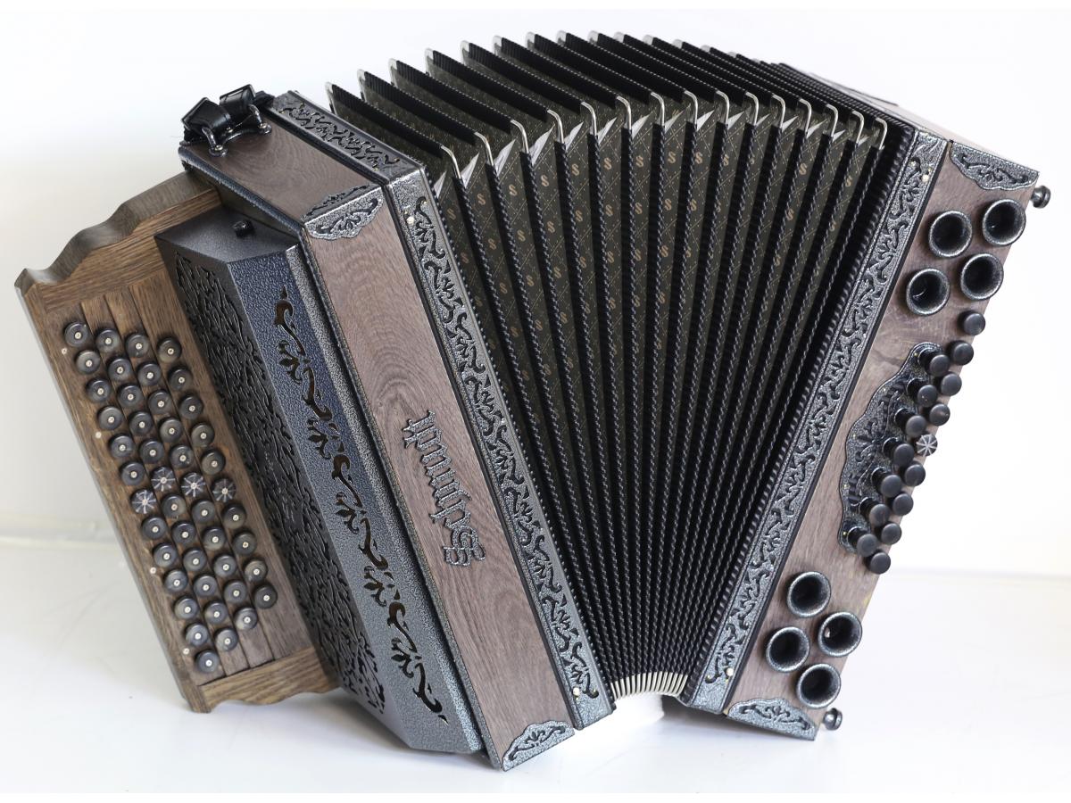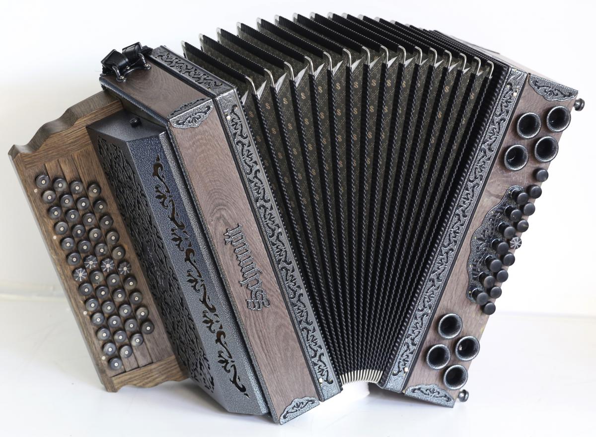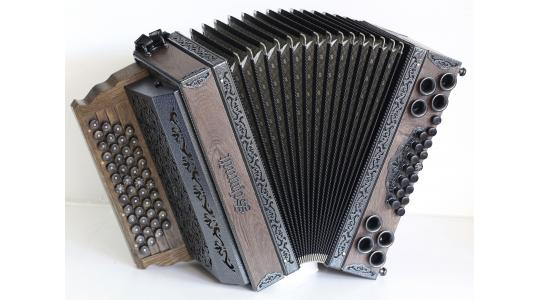Ein Modell voller Überraschungen: Rustikales Design, als ob die Harmonika 50 Jahre am Dachboden gelegen wäre, technisch jedoch auf dem neuesten Stand. Neueste Beschläge, kratzfestes Design in Schwarz-Silber oder Schwarz-Gold, leicht gebürstete (Alt)Hölzer, Knöpfe aus echtem Horn oder Holz verleihen der Harmonika eine rustikal-edle Anmutung.